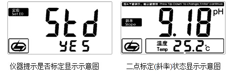 c) 同理,再次清洗電極并插入標(biāo)準緩沖溶液2中(pH=9.18pH的標(biāo)準緩沖溶液中);如儀器沒接溫度電極則可用溫度計測出溶液的溫度值(如25.2℃),并設(shè)置溫度值;稍后,待讀數(shù)穩(wěn)定后,按“斜率”鍵,再確認,儀器自動識別當(dāng)前標(biāo)液并顯示當(dāng)前溫度下的標(biāo)準pH值(如9.18pH),顯示如圖: