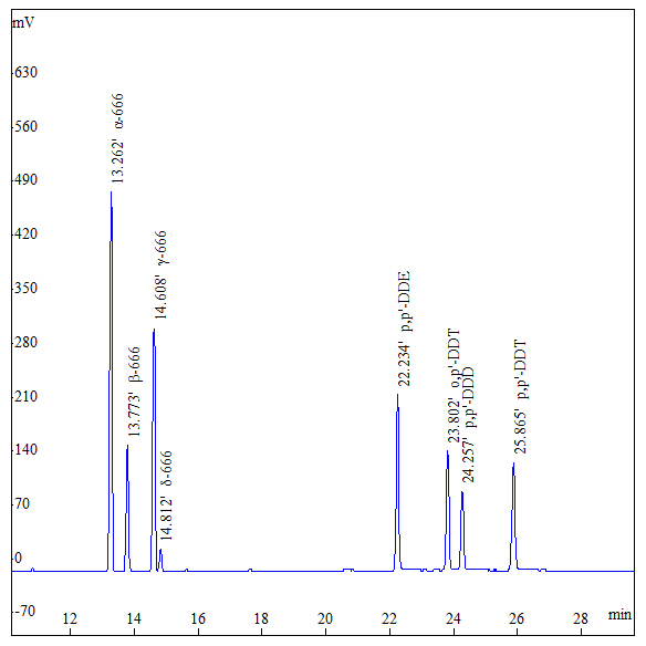 色譜圖出峰順序依次為α-HCH、β- HCH、γ- HCH、δ- HCH、p,p’-DDE 、o,p’-DDT p,p’-DDD 和p,p’-DDT。