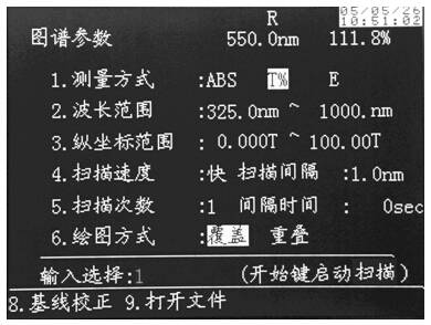 測量方式可設(shè)置吸光度、透射比和能量方式。能量方式中的倍率設(shè)置可在參數(shù)設(shè)置完成后,按“調(diào)零/調(diào)滿度”選擇適當?shù)谋堵,并在屏幕上顯示倍率數(shù)值。