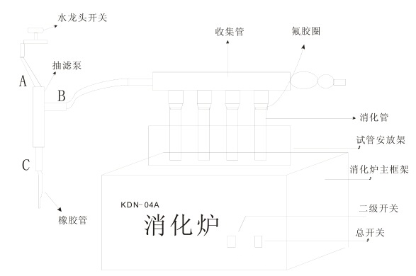 1.將裝有樣品的消化管安放在試管安放架上,裝上氟膠圈和收集管,一起安放在消化爐主機(jī)上面。(如上圖所示)