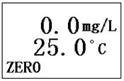 將溶解氧電極放入5%的新鮮配制的亞硫酸鈉溶液中,在儀器處于溶解氧測量工作狀態(tài)下,按“模式”鍵,儀器即進入“零氧校準”工作狀態(tài),待讀數(shù)穩(wěn)定后,按“確定”鍵,貯存電極當前的零氧值,零氧校準結(jié)束。此時,儀器還處于“零氧校準”工作狀態(tài)。再按“模式”鍵,儀器進入“滿度校準”工作狀態(tài)。零氧校準顯示界面如下: