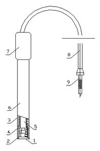 組裝時(shí),用鑷子將專性透氣薄膜(1) 放于電極外殼前帽(4)的內(nèi)腔底部,將硅橡膠墊圈(2)套在電極外殼主管(6)的頂端,然后將電極外殼前帽緊緊旋在外殼主管上,使專性透氣薄膜緊夾在墊圈與前帽內(nèi)腔底之間并絕不滲水,將已配制好的內(nèi)溶液緩緩注入電極外殼腔體內(nèi),約注滿2/3容積即可。然后把內(nèi)電極(5)輕輕放進(jìn)電極外殼中,使內(nèi)電極的平面敏感玻璃膜接觸到透氣膜,將電極外殼后帽(7)旋于外殼主管后部。當(dāng)外殼后帽旋到與主管外螺紋時(shí),應(yīng)拉住電級導(dǎo)線(8)將內(nèi)電極輕輕上下拉動(dòng)數(shù)次,以使內(nèi)溶液中余留的氣泡上升至內(nèi)溶液的上部,然后向下旋緊外殼后帽,使內(nèi)電極的平面敏感玻璃能緊貼專性透氣膜,由此而使內(nèi)電極的平面敏感玻璃與專性透氣膜間的內(nèi)溶液能形成一極薄的液層。最后將組裝完畢的電極頭部向下,垂直或略有傾斜地固定在支架上,等待測試。