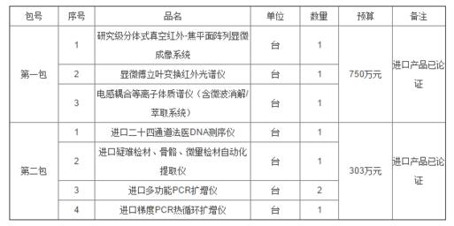 7月25日,甘肅省公安廳全省刑事技術(shù)鑒定中心發(fā)布了實(shí)驗(yàn)室設(shè)備招標(biāo)公告,采購儀器包括顯微成像系統(tǒng)、紅外光譜儀、離子體質(zhì)譜儀、PCR擴(kuò)增儀等檢測儀器,總預(yù)算達(dá)到了1053萬(人民幣)。