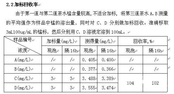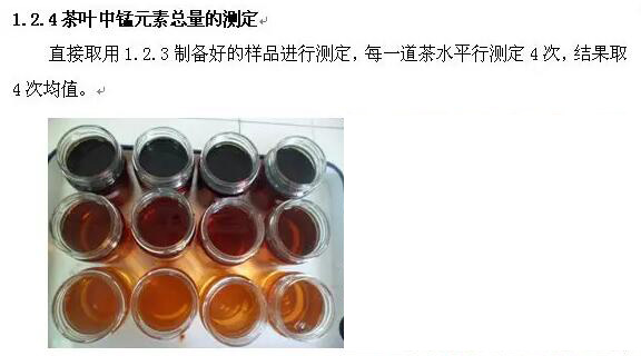 本實(shí)驗(yàn)著重對(duì)茶葉中錳的自然溶出量進(jìn)行測(cè)試,并對(duì)現(xiàn)泡茶與隔夜茶進(jìn)行比較,給廣大飲茶愛好者一個(gè)參考依據(jù)。