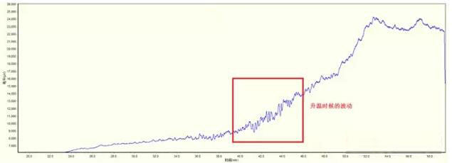 圖8 FID噴咀未擰緊漏氣升溫時(shí)候引起的基線波動(dòng)