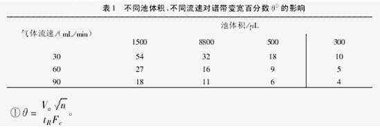 (1)為保持毛細(xì)管柱達(dá)一定的柱效,需加尾吹氣,以減小譜帶柱后變寬。表1為n=3000m-1,tR=5min時,不同檢測器體積和不同氣體流速時,譜帶變寬的百分?jǐn)?shù)(θ)?梢钥闯觯和簧鞯挠绊懽V柱,其后接的ECD池體積越大,為達(dá)相同柱效所需尾吹氣流速越大。