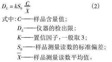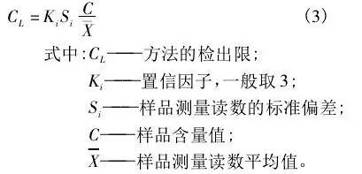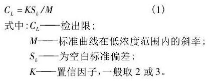 1947年,德國人Hkaiser首次提出了有關分析方法檢出限的概念,并提出檢出限和分析方法的精密度、準確度一樣,也是評價一個分析方法測試性能的重要指標。國際純粹與應用化學聯(lián)合會(IU-PAC)于1975年正式推行使用檢出限的概念及相應估算方法,于1998年又發(fā)表了《分析術(shù)語綱要》對檢出限檢出,檢出限的定義為:某特定方法在給定的置信度內(nèi)可從樣品中檢出待測物質(zhì)的最小濃度或量,公式表示為: