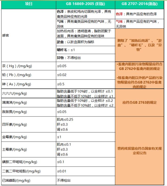 3、GB2707-2016中色澤和氣味有所變化,并且刪除了感官項目中“加熱后肉湯”、“淤血”、“硬桿毛”和“異物”的限量。