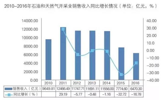 2016年,我國石油和天然氣開采業(yè)行業(yè)資產(chǎn)總額為20036.3億元,同比下降3.09%;實現(xiàn)銷售收入6470.3億元,同比下降16.78%;利潤總額同比下降159.18%。