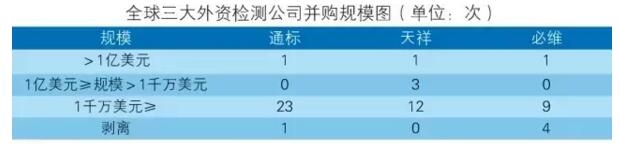 下表列出了國家三大巨頭檢測公司最近收購數(shù)量與規(guī)模情況: