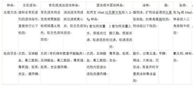 常見(jiàn)的中毒物質(zhì)主要有農(nóng)藥(有機(jī)磷和氨基甲酸酯類)、鼠藥(毒鼠強(qiáng)、氟乙酰胺、敵鼠、安妥)、亞硝酸鹽、甲醇、砷和汞、氰化物、非食用油和酸敗油脂等等,F(xiàn)場(chǎng)操作時(shí),可視不同的物質(zhì)采取不同的處理方法測(cè)定一個(gè)系列的項(xiàng)目。這樣可以免去許多樣品前處理的重復(fù)操作,降低工作量,提高工作效率。步驟如下: