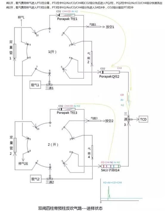 缺點(diǎn):分析時(shí)間較長(zhǎng),閥2在關(guān)閉5A分子篩色譜柱過(guò)程中,會(huì)有微量空氣滲透,出現(xiàn)小氧氣峰、小氮?dú)夥甯蓴_,干擾峰的大小和閥2關(guān)閉時(shí)間成正比。