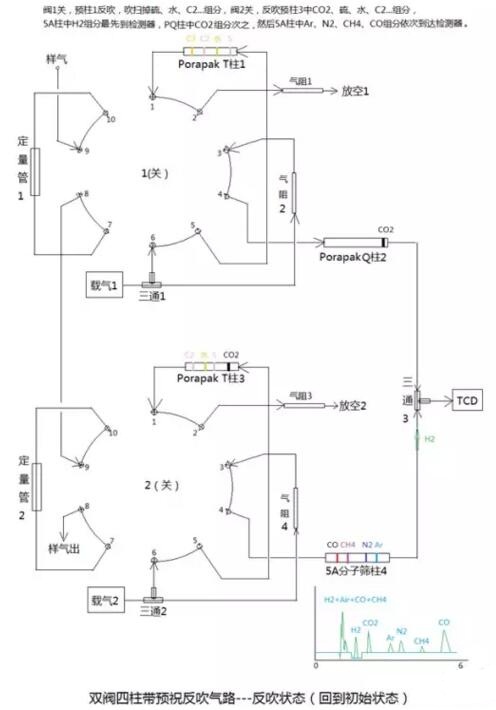 優(yōu)點(diǎn):在雙閥三柱帶預(yù)柱反吹氣路閥圖基礎(chǔ)上,縮短了分析時(shí)間,去除了空氣干擾峰。