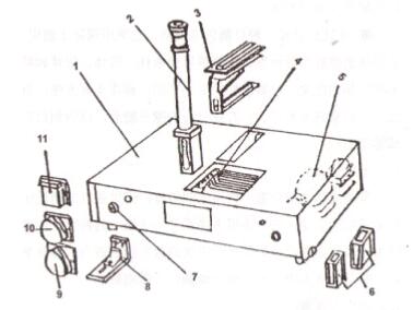 1、比色箱 2.觀察筒3.透明樣品架 4.有色玻璃架(1塊)5.燈泡(4 只,其中兩只備用)